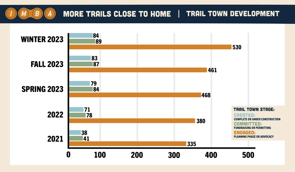 IMBA worked with 174 new communities in 2023. Now, 619 communities are committed to trails or engaged in the process, with 84 more having realized their vision for more and better trails close to home.