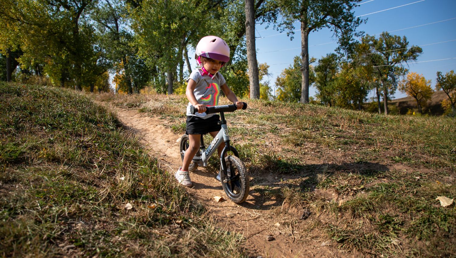 When my daughter was 5 months old, it was simple taking her out on the trails. I just strapped her into her bike seat and off we went. The following year, at almost 2 years old, she was way too wiggly to ride behind me in her seat. Luckily, we had started her on Strider’s 2-in-1 Rocking Bike the Christmas prior. We had recently removed the Strider 12 Pro from the rocking base and she was striding around with ease. At that point she wasn’t ready for the mountains, but with her Strider in tow, we hit the beautiful Black Hills and created our own adventures. One of her favorite games was playing eye spy while we rode the trail. We literally stopped to smell the flowers, rode through the mud puddles, and tried to find as many animals as we could.
