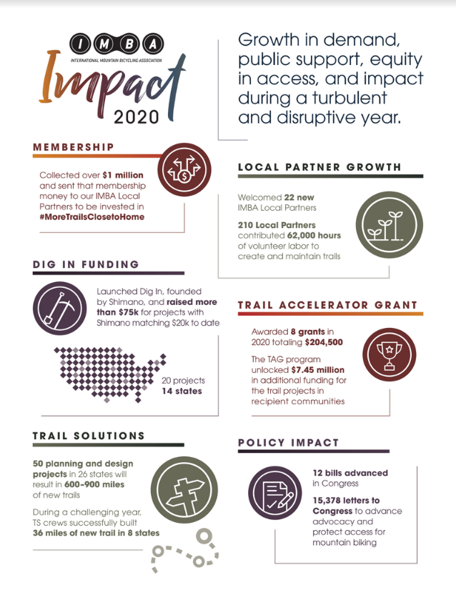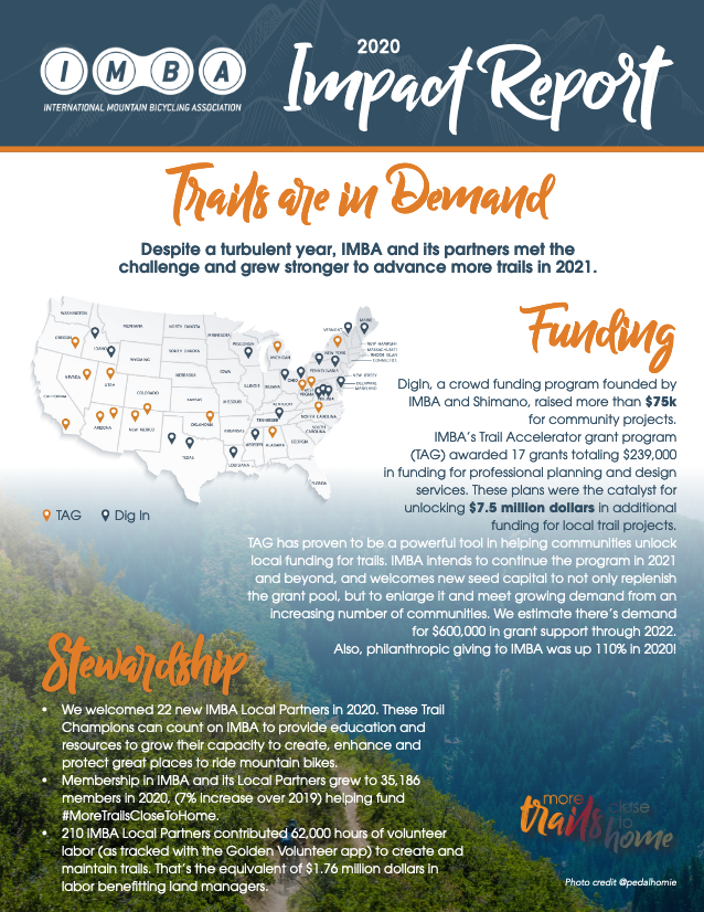 With the support of our members, partners, and donors, IMBA had a very strong year in 2020. Philanthropic giving was up 110%. We onboarded 22 new IMBA Local Partner organizations. More than 40 Corporate Partners actively supported our work nationally. IMBA Trail Solutions helped plan and design what will become 600–900 miles of new trail. Our Government Affairs team helped 12 bills advance in Congress. Our Trail Accelerator grants awarded $204,500 in 2020, that became the catalyst for more than $7 million in funding for eight trail projects. And IMBA renewed strong partnerships with PeopleforBikes and National Interscholastic Cycling Association (NICA).