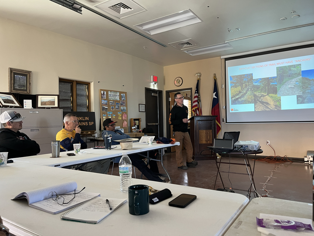 Gathering at the visitors center near the Tom Mays area of the park, participants learned both in the classroom and out in the field over the course of 3 days. This time together covered everything from the basics of trail design and construction to the intricacies of maintenance and sustainability. During the classroom section, seasoned volunteers were surprised by the transition away from water bars and into rolling grade dips. “For us, water bars were current knowledge,” said Joe. But after their field time together on Agave Loop, all were singing the praises of rolling grade dips and their ability to sheetflow water off of trail tread.