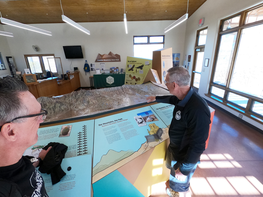 Chris Orr and Joe Garibay (BMBA president) look over a model of the Franklin Mountains in the visitors center.
