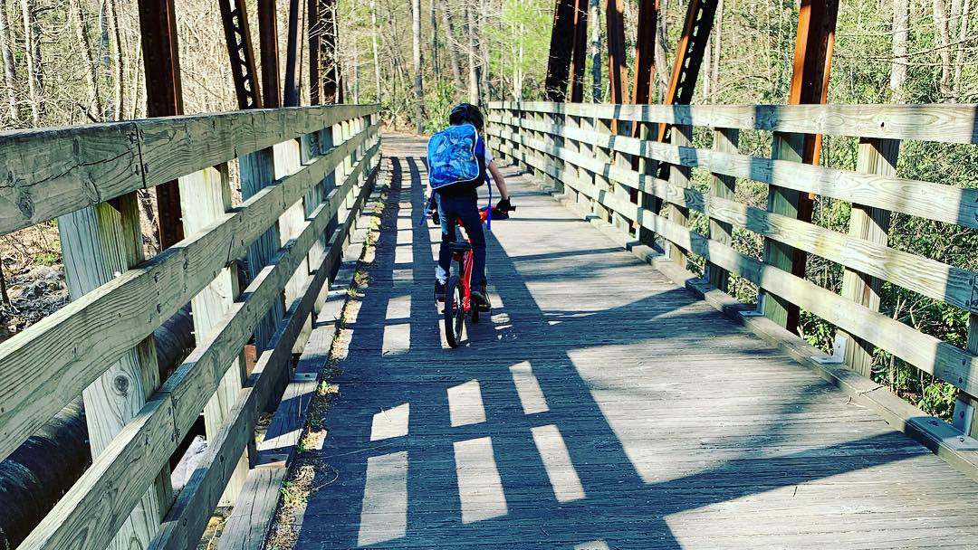 He’s heard me talk about my bikepacking trip and has asked questions about bikepacking, so I decided now would be a good time to introduce him to the concept. The Virginia Creeper Trail is a rail trail in Damascus, VA that travels 34 miles from Abingdon, VA to Whitetop, NC and weaves along route 58 and the Holston River. We set out on the rail trail one Friday afternoon in April to see how far we could make it. My bike was loaded down with all of the camping gear and most of the food we would need. Miles carried his Batman backpack, filled with his own food and tent poles strapped to the handlebars of his 16” Specialized HardRock.