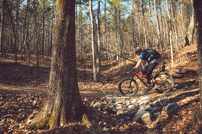 Jake’s daily duties span from mowing the grass at the trailhead, manicuring the jump and flow trails, and everything in-between. But, his daily duties all stem from the relationships he and Traci have built within the city. “We work with the National Park and AJ [Johnson] at Cedar Glades [a county park] daily to keep this entire trail system looking and feeling seamless to riders,” said Jake. One of Jake’s other key responsibilities is coordinating with IMBA Local Partner Trail Advocacy Coalition of the Ouachitas (TACO) for monthly trail workdays.