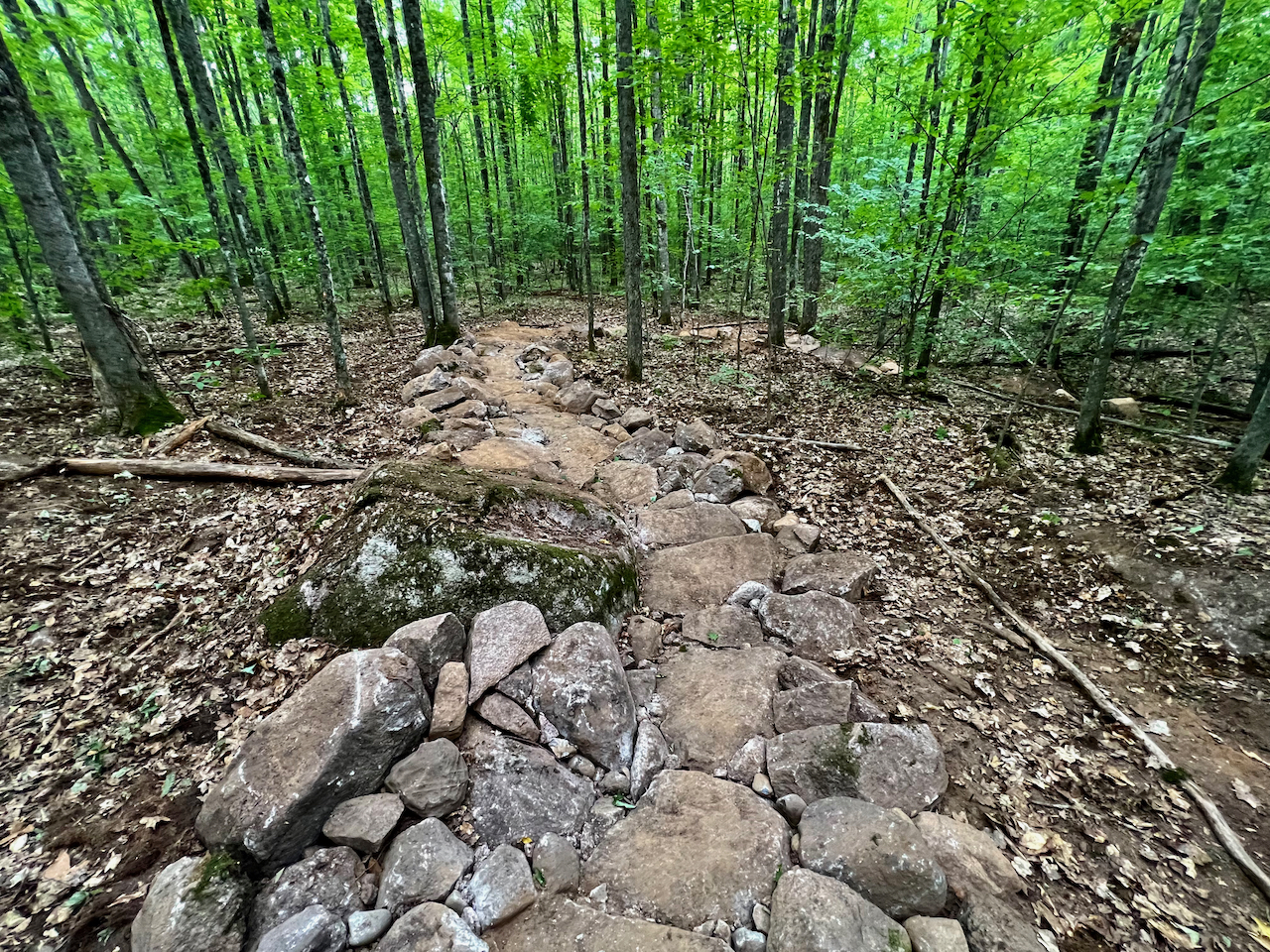 The team identified 5,000 acres between Goodman and McClintock Parks for trail development and connectivity. These two parks, already equipped with CCC-era cabins and picnic areas, would serve as activation anchors for the future trail system. “You’ll find yourself pedaling through smooth-flowing hills of mature aspen and oak stands, and riding technical and tessellated rocky runs,” said Matthew Shruck, Assistant Facilities and Parks Director for Marinette County. “As you make your way between elevation and marshy lowland areas, you’ll lose count of all the trailside boulders left behind by the glaciers that made the whole scene possible.” County officials and MAMBA wanted to put together a plan that would attract riders of all skill levels, make use of the numerous granite deposits that pepper this undeveloped forest landscape, and create a true destination.
