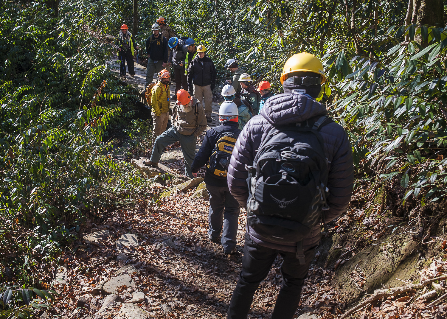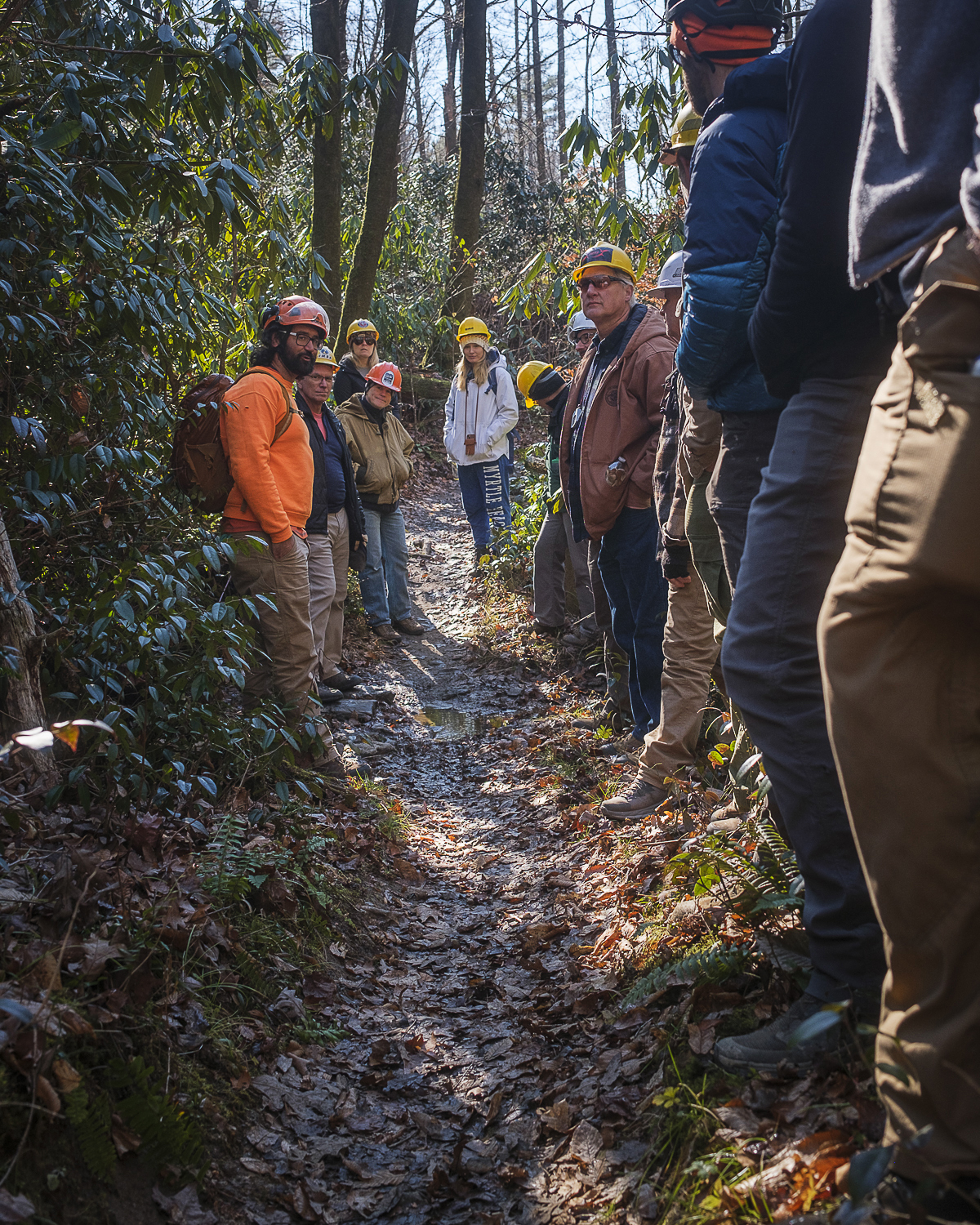 Following our two virtual sessions, we hosted two one-day field courses in Brevard, NC on the Pisgah National Forest. The Pisgah National Forest is host to many great examples of trails that are in need of attention. As a popular destination for all sorts of outdoor ventures, and the climate of a temperate rainforest, with many legacy trails on the ground, many of the trails in Pisgah are well worn and show signs of needing attention. Our day began with a quick recap of trail concepts, then participants were led on a tour of trails, highlighting specific problem areas. Post lunch we lead our group to an area that is scheduled for a large trail project, Cat Gap and Butter Gap, led by our Pisgah Area SORBA chapter. It's one thing to discuss problem areas in the classroom, but to be able to see these issues first hand, participants came away from the training with a good idea of what issues to look for in their local area. As a result of the Challenge Cost Share agreement, a cadre of over 20 volunteers and Forest Service employees learned how to complete an in-depth trail assessment during the field training.