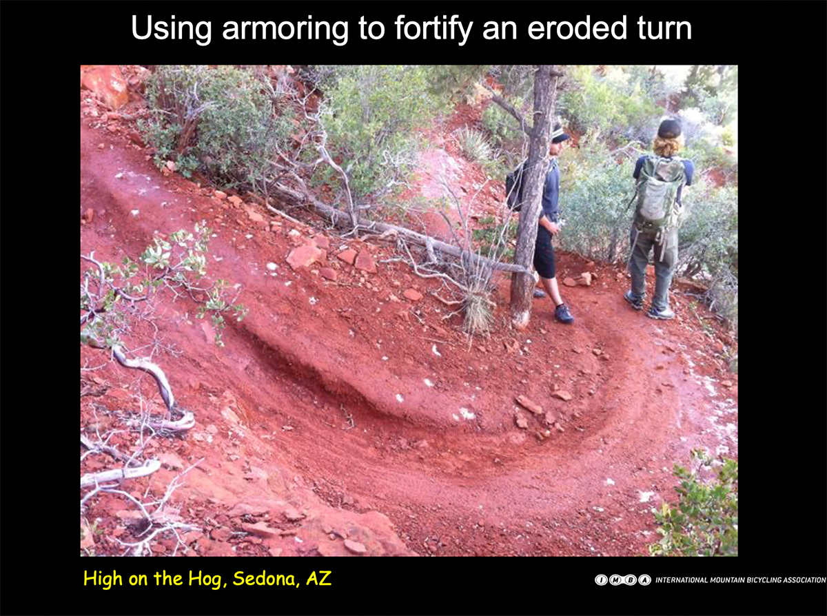 Lars explained that while armoring wasn't new to Sedona, the IMBA Trail Care Crew's 2014 visit helped refine their techniques and incorporate more bike optimized type features. The "High on the Hog" rock berm was a prime example, and its success normalized such construction. "We've subsequently done a lot more of that type of technique," Lars stated. This approach considers the unique forces exerted by bicycles, shifting from traditional outslope designs, which can lead to erosion from shear forces, to insloped turns, sometimes armored, that promote compaction. "If you don't do it, it's then it just gonna turn into problems for maintenance down the road," Lars emphasized, highlighting Sedona's erosive soils.