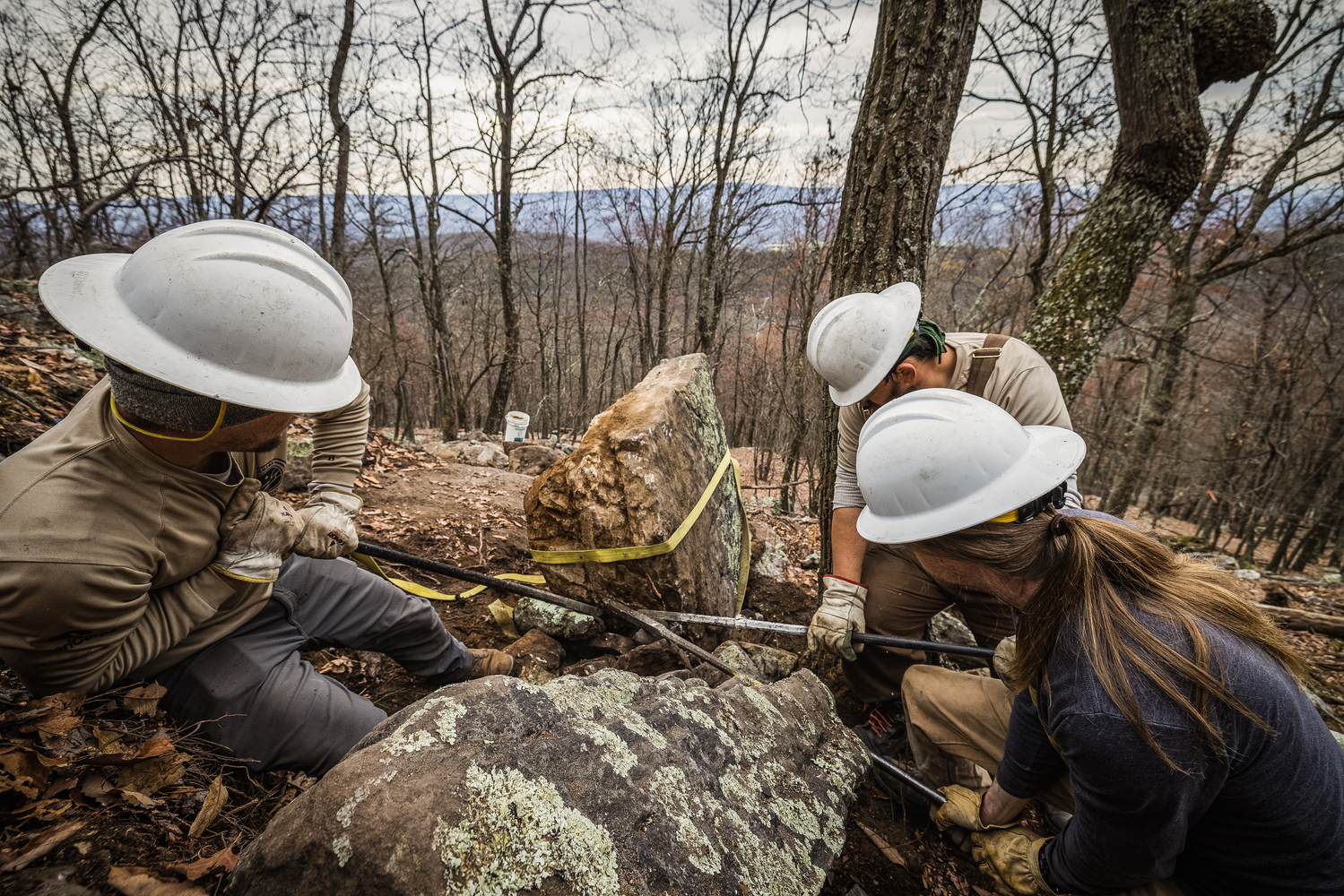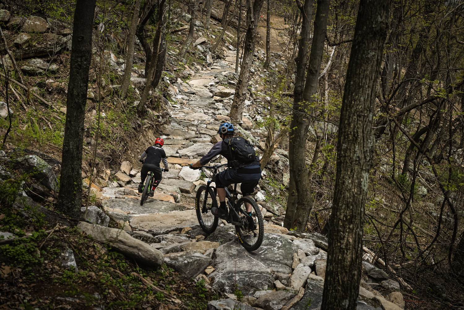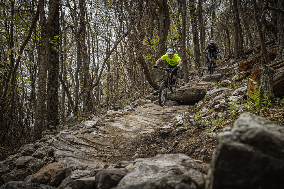 To honor the park’s CCC legacy, IMBA staff are working with the Appalachian Conservation Corps (ACC) to construct the handbuilt portion of the 1.5-mile black diamond trail. The partnership is an opportunity for IMBA to provide hands-on training for the next generation of trail builders. IMBA and ACC crews have spent the past three months at Cacapon wrestling bullet-hard sandstone boulders in the snow, sleet, and rain, an often slow and backbreaking process, but the resulting rock-armored trail is as much a work of art as it is a rowdy descent. “Some of the rock work is just stunning and it really beckons back to the CCC origins of this park,” says Cacapon Resort State Park Foundation board member Mark Hoyle. “You see the old trails with these amazing staircases and hand-stacked rocks that were done way back during that era and this is just building upon that heritage. It’s really exciting.” Want to learn more about what IMBA is working on at Cacapon (and how we’re getting it done)?