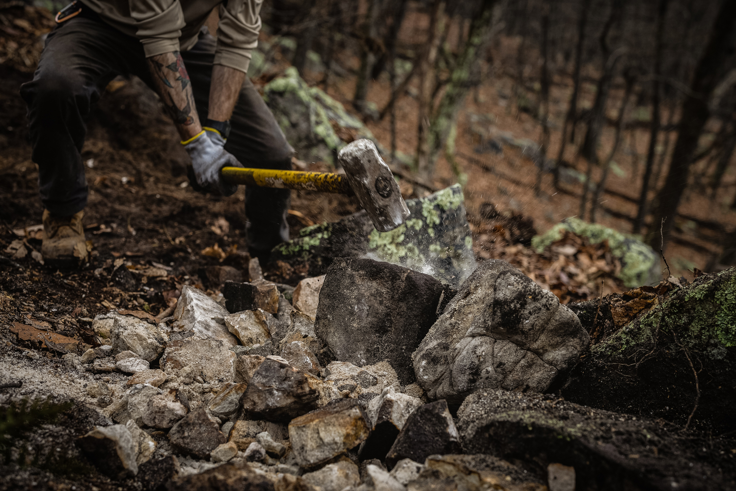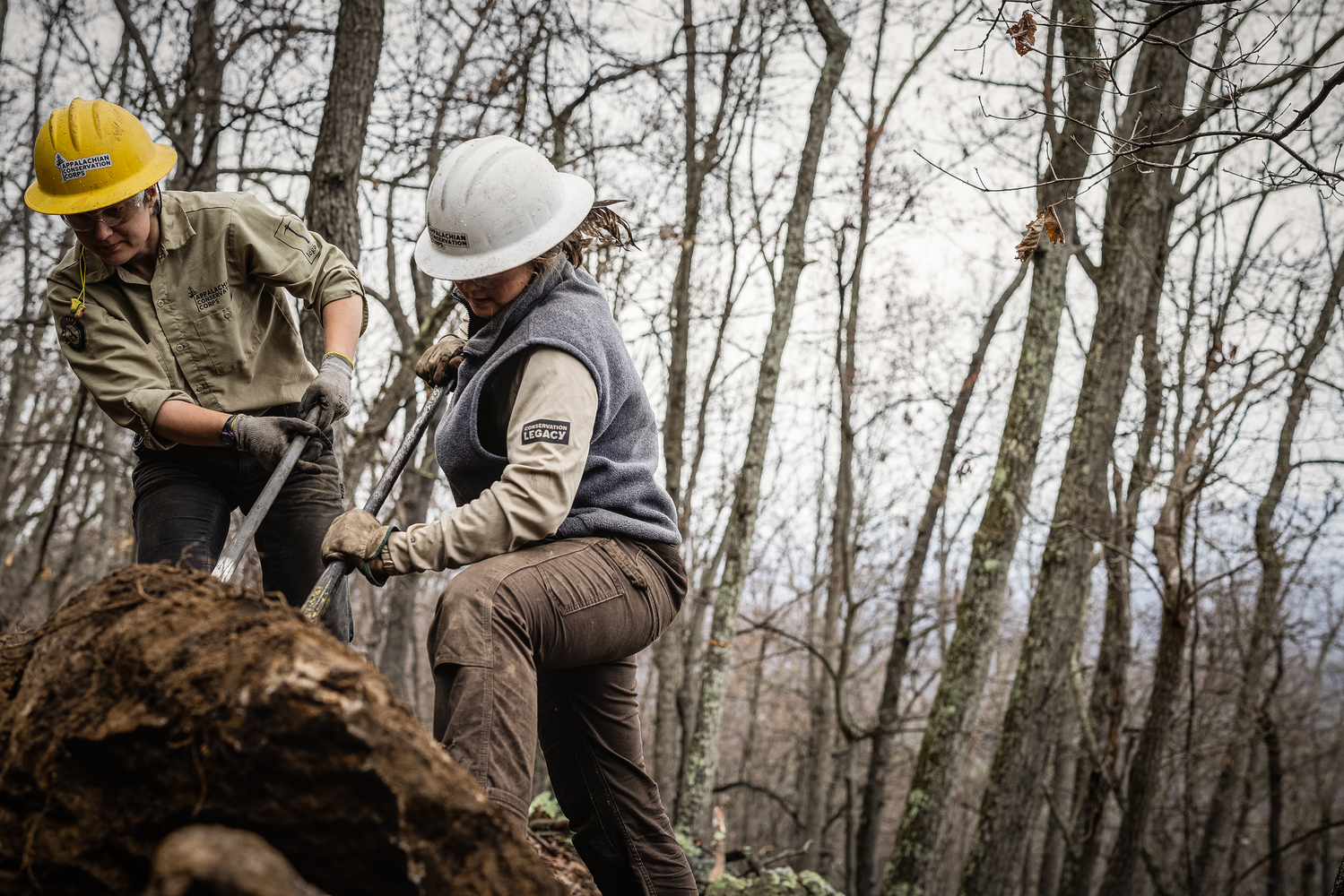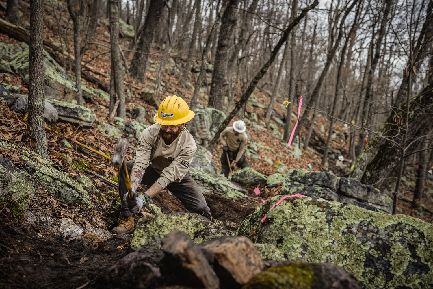 To honor the park’s CCC legacy, IMBA staff are working with the Appalachian Conservation Corps (ACC) to construct the handbuilt portion of the 1.5-mile black diamond trail. The partnership is an opportunity for IMBA to provide hands-on training for the next generation of trail builders. IMBA and ACC crews have spent the past three months at Cacapon wrestling bullet-hard sandstone boulders in the snow, sleet, and rain, an often slow and backbreaking process, but the resulting rock-armored trail is as much a work of art as it is a rowdy descent. “Some of the rock work is just stunning and it really beckons back to the CCC origins of this park,” says Cacapon Resort State Park Foundation board member Mark Hoyle. “You see the old trails with these amazing staircases and hand-stacked rocks that were done way back during that era and this is just building upon that heritage. It’s really exciting.” Want to learn more about what IMBA is working on at Cacapon (and how we’re getting it done)?