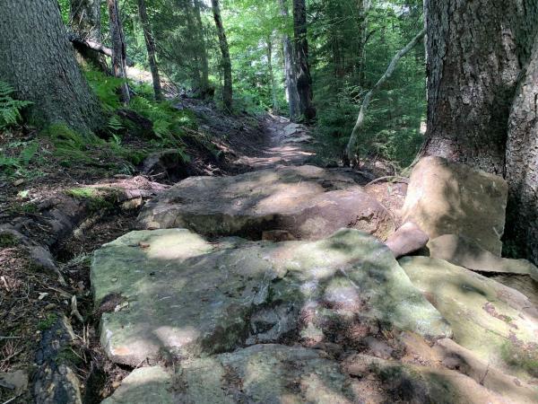 Segment four was an existing technical descent, a rocky, rooty, burnt-in trail that represents old-school, gnar, West Virginia riding. Locals will be happy to see this stretch of hometown trail in the world cup, and this shredfest is likely to be a spectator favorite. A rock garden at the top needed a little refurbishing, and the team collected a ton of rock, even driving the excavator around the forest edges to harvest chunky slabs. They crafted a chundery, stacked rock stairway with masses that ranged from the size of a microwave to a kiddie pool.