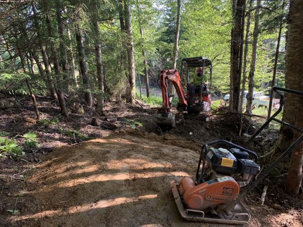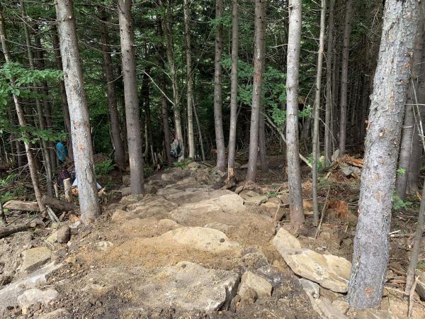 The first segment the crew worked on is sure to spur some jaw-dropping riding. A rocky but fast singletrack tread descends into a tight right-hand corner, rumbles through a steep, off-camber, rooty section, and then shoots into a big berm that grabs riders and slings them back onto the course. The crew put some serious TLC into machine building and hand finishing the berm.
