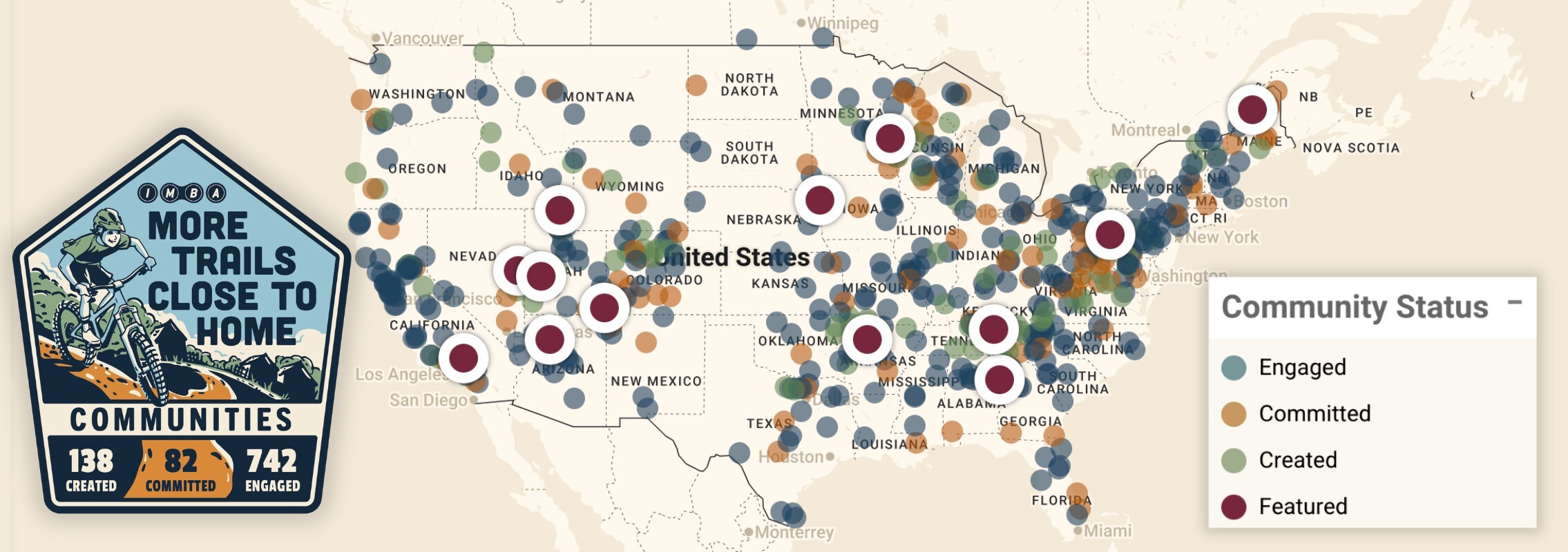 IMBA leads and helps to create, enhance, and protect great places to ride. Since 2020, we have focused on more trails close to home, an initiative to impact 250 communities by the end of 2025. As of early 2025, 625 communities are engaged in the process and nearly 200 have been positively impacted: 102 have created new trails and more than 93 are committed and ready to create their trail project.