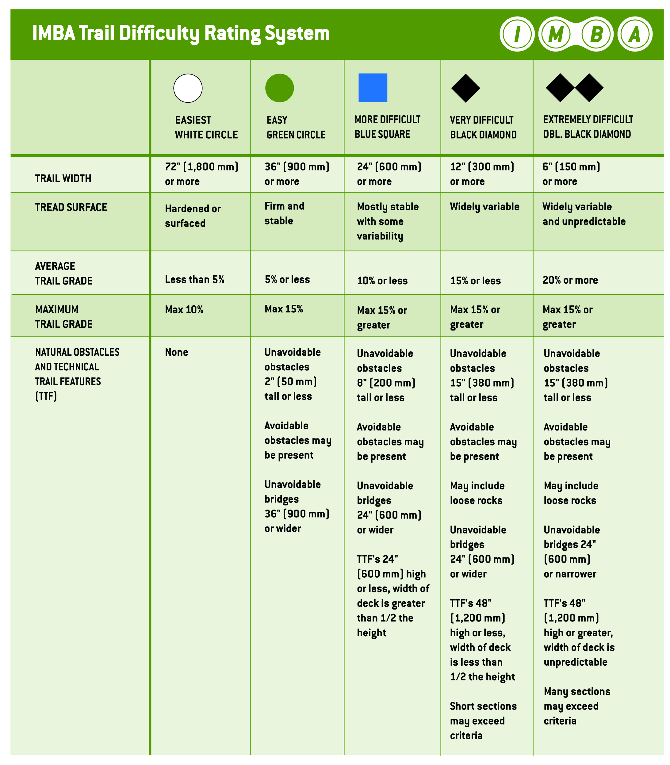 The IMBA Trail Difficulty Rating System is a basic method used to categorize the relative technical difficulty of recreation trails. The IMBA Trail Difficulty Rating System can: